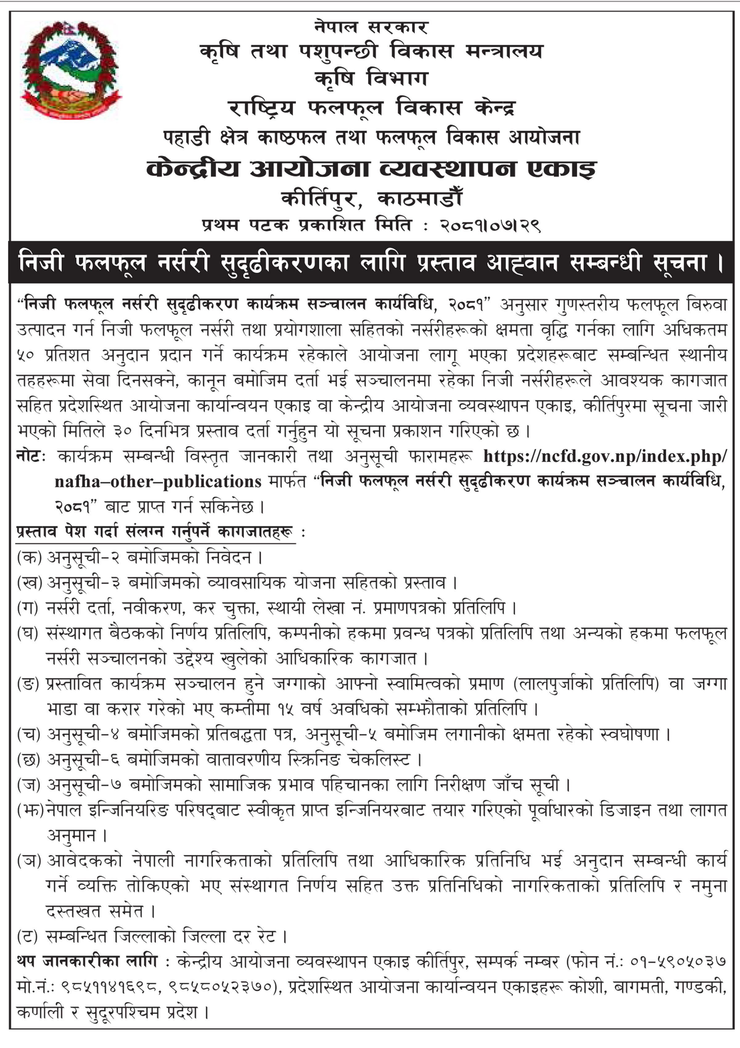 Notice regarding call for proposals for strengthening private fruit nurseries