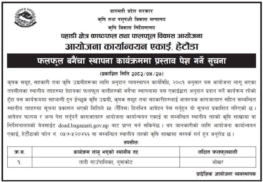 Notice for submitting proposals for fruit orchard establishment program, PIU Bagmati